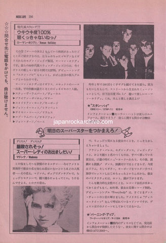 Note: 1 page, articles w/ photos on both sides of page. Big Country on one side, Roman Holiday and Madonna on the other. Both sides shown. Japanese text. Articles introduce the artists to Japanese readers as important new artists. Very early if not very first appearance of the artists in the Japanese music press.