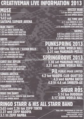 Note: Text and graphic on both sides of flyer, both sides shown. Reverse side lists other upcoming Japan Tours promoted by Creativeman: Muse, Bloc Party., Gotye, Crystal Castles / Sleigh Bells, Carly Rae Jepsen, Sonata Arctica, Yeasayer, Dead Can Dance, All Time Low, Pil, Sigur Ros, Ringo Starr & His All Starr Band. Mint condition