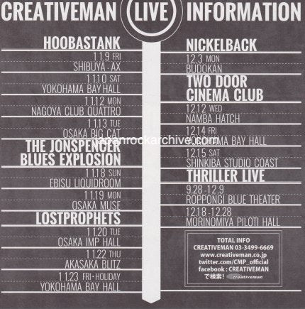 Note: Text and graphic on both sides of flyer, both sides shown. Reverse side lists other upcoming Japan Tours promoted by Creativeman : Hoobastank, The John Spencer Blues Explosion, Lost Prophets, Nickelback, Two Door Cinema Club, Thriller Live. Mint condition